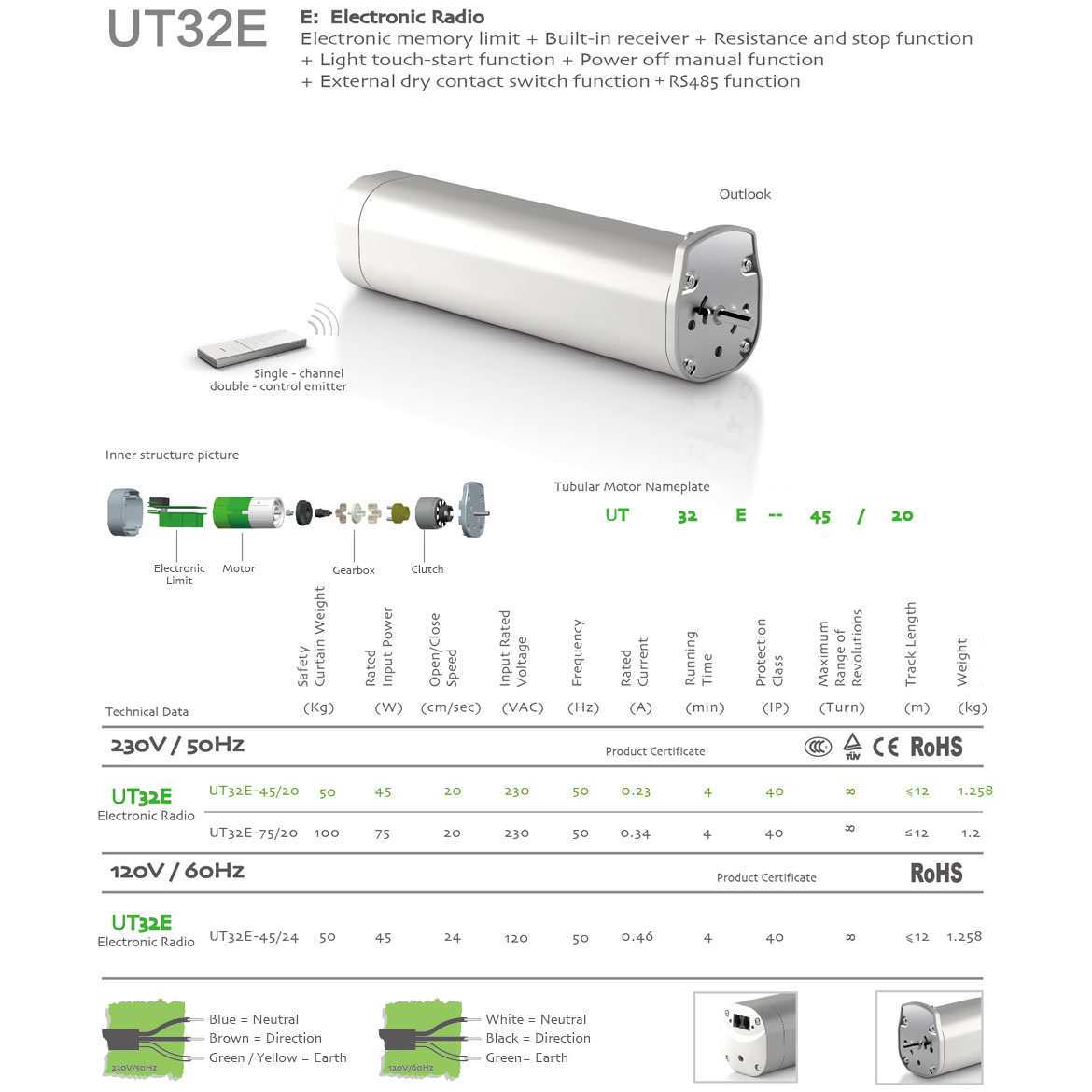 Memorized Limit+Integrated Radio Control+Obstruction Detection+Light touch-start+Manual Override+The third limit position+Compatible with dry contact switch function.