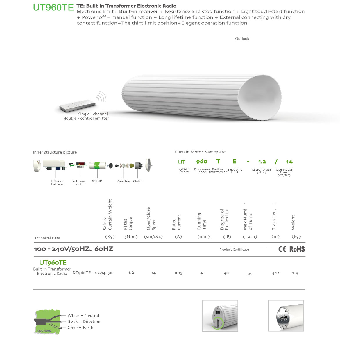 Built-in Transformer(100V-240V)+Elegant operation+Memorized Limit+Integrated Radio Control+Obstruction Detection+Light touch-start+Manual Override+The third limit position+Compatible with dry contact switch function.