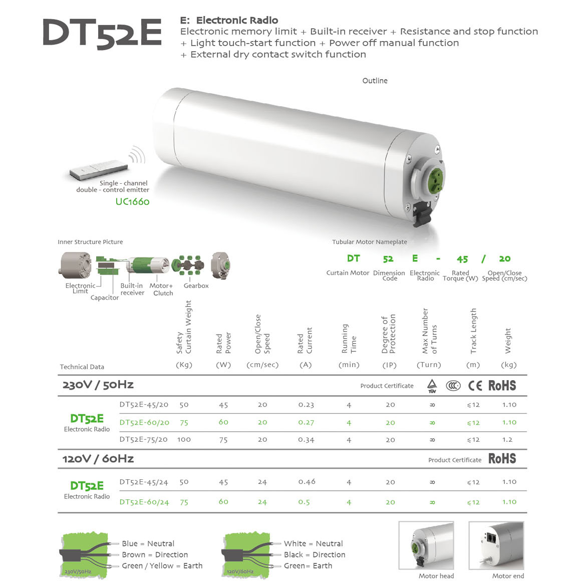 Memorized Limit+Integrated Radio Control+Obstruction Detection+Light touch-start+Manual Override+The third limit position+Compatible with dry contact switch function.