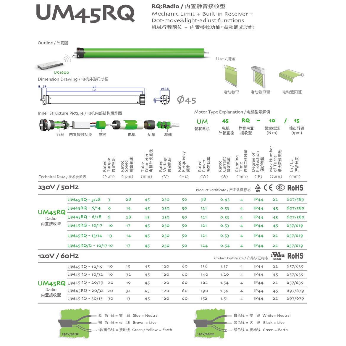 RQ:Quiet/静音型 机械行程限位+内置接收器+点动调光功能+静音功能